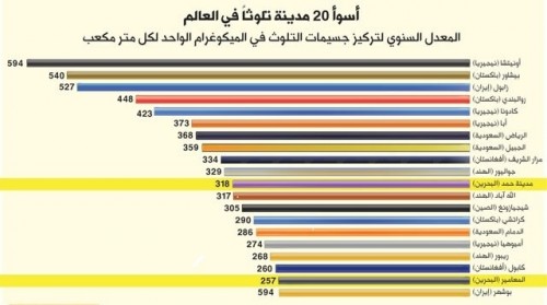 The report states that the air pollution is measured by calculating the annual average concentration of particulate matter pollution in one microgram per cubic metre. The results revealed that Hamad Town, which was listed as the 11th most polluted city in the world, had an average of 318, while Ma'ameer had an average of 257, making the 19th place in the list.