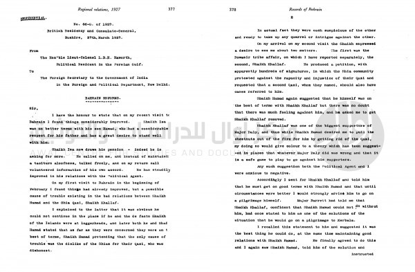 According to a British document seen by Bahrain Mirror (from the archives that Awal Centre for Studies and Documentation is in the process of translating), Sheikh Khalaf was one of the biggest supporters of the British reforms led by Major Daily, who overthrew the anti-Shia oppressive rule of Isa bin Ali. For this reason particularly, the British Resident in the Gulf, Lionel Haworth, hesitated to accept the request of Sheikh Hamad bin Isa, the new ruler of Bahrain, to remove Sheikh Khalaf from office, according to the letter issued in March 1927.