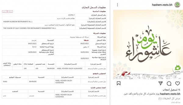 Bahrain Mirror (Exclusive): An ad posted by a Jordanian restaurant in Bahrain caused a wave of anger. A restaurant known as "Hashem Restaurants Jordan" which owns a series of branches in Bahrain posted a photo on its Instagram account that read "Happy Ashura Day". This expression stirred anger of the restaurant followers on Instagram, which made it delete the post and all the comments below, although comments are open on ads of the restaurant's other account.