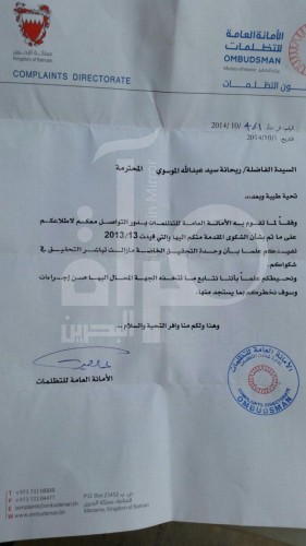 هذا وتنشر مرآة البحرين صورة من رسالة الأمانة العامة للتظلمات إلى ريحانة الموسوي مؤرخة في 1 أكتوبر/تشرين الأول 2014، والتي تؤكد تلقيها لشكوى ريحانة، ومتابعة مستجداتها مع وحدة التحقيق الخاصة التابعة للنيابة العامة.