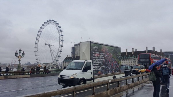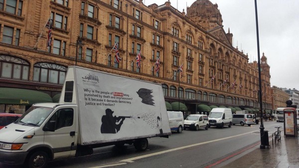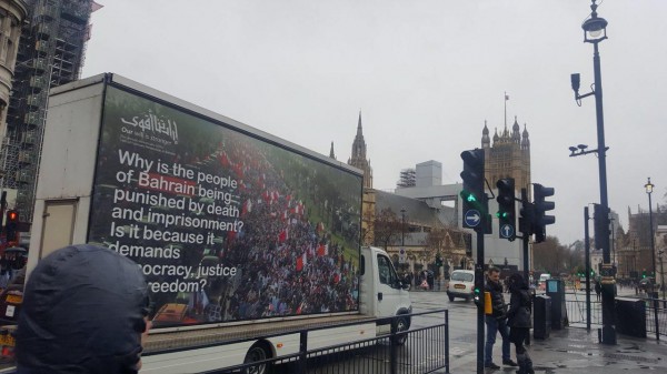 في الذكرى السابعة للثورة… سيارات دعائية تجوب شوارع لندن مع صور عن الاحتجاجات في البحرين