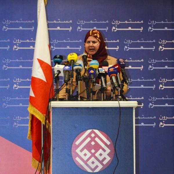 كما وجهت في حديثها تحية إجلال وتقدير لأرواح شهداء البحرين وللأسرى وللمبعدين ولتراب البحرين والقابضين على الجمر.