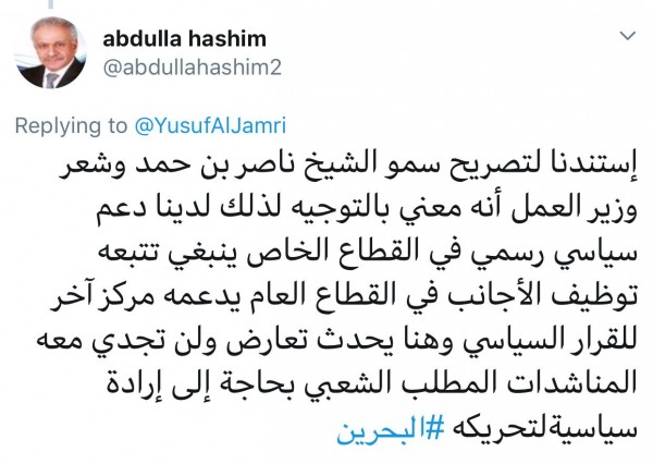 دون لف ودوران، عبدالله هاشم يعمل الآن لصالح رئيس الوزراء خليفة بن سلمان المستاء من تأخره وراء ولي العهد النائب الأول لرئيس الوزراء، يغمز هاشم ويلمز باتجاه ولي العهد وفريقه الاقتصادي، ويوارب القول أنهم يعارضون حصول البحرينيين العاطلين على حقهم في الوظائف بالقطاع العام، وأنهم مركز القرار الذي يدعم توظيف الأجانب، بل إنه يطالب ولي العهد وفريقه الذي دخل على خط توظيف العاطلين بإعلان خطتهم لحل معضلة بطالة البحرينيين سريعاً فيقول «إذا لم تعلن خلال الأسبوع الجاري فهو مجرد إعلام وتسويف». بذكاء يختبىء عبدالله هاشم تحت تصريحات ناصر بن حمد الذي «وجّه لتوظيف الشباب».