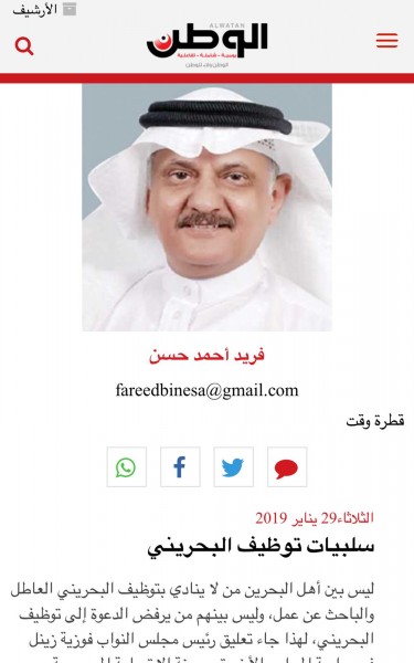 وإذا كان كلام المجنّس المشعل مؤلماً، فإن الأشد مضاضة أيضاً أتى من بحرينيين، أمثال فريد حسن أحد كتّاب صحيفة الوطن، الذي كتب مقالاً لا يقل وقاحة وفداحة عن مشعل، إذ كتب في 29 يناير/كانون الثاني الماضي، مقالاً تحت عنوان عارٍ في القبح «سلبيات توظيف البحريني»، كرر فيه الصور النمطية الكاذبة مثل «البحريني في الغالب يتحمس في البداية لكنه بعد قليل لا يعطي المتوقع منه والذي على أساسه تم توظيفه، وكذلك في تركه الوظيفة لو توفرت له وظيفة أخرى براتب وامتيازات أفضل». بل إنه يتمادى ويحذر من أنّ «الركون إلى العاطفة في ملف توظيف البحرينيين العاطلين والباحثين عن عمل يضر بكل الأطراف ذات العلاقة، وهذا يشمل توظيفهم في القطاعين العام والخاص».