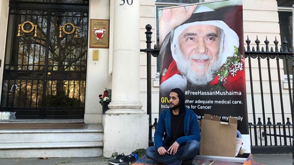 وكان الناشط علي مشيمع قد عاود الاحتجاج أمام السفارة البحرينية في العاصمة البريطانية لندن، وكتب عبر تويتر «مرة أخرى أجد نفسي مضطراً للإحتجاج في سبيل إنقاذ والدي الأستاذ حسن مشيمع الذي يحرم من العلاج في سجن جو سيء الصيت».