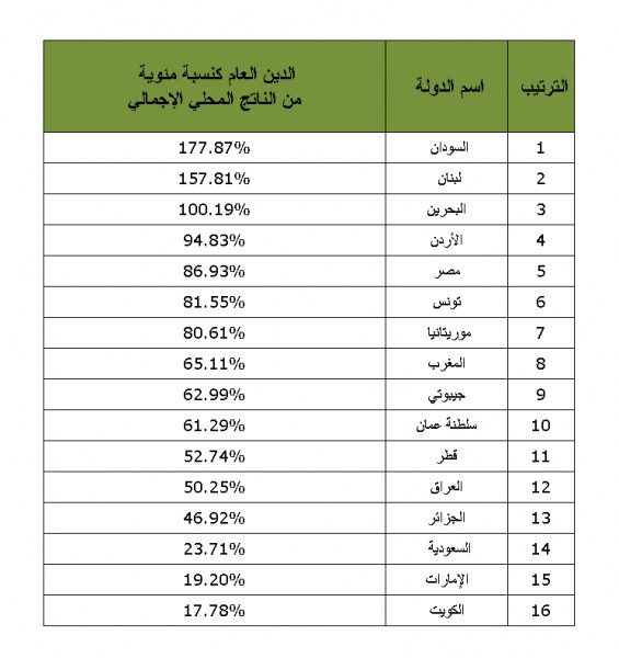 وفي ما يلي ترتيب الدول العربية من حيث حجم الدين العام كنسبة مئوية من الناتج المحلي الإجمالي (2020):