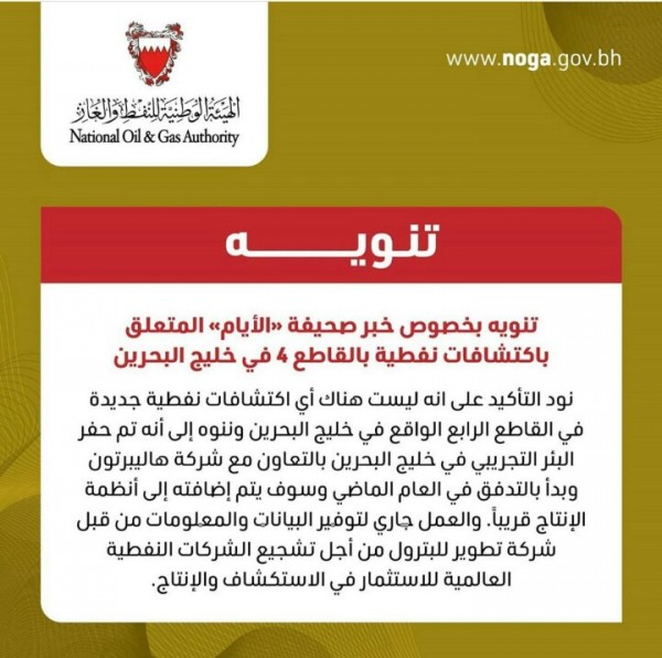 مرآة البحرين: أصدرت الهيئة الوطنية للنفط والغاز في البحرين نفياً لما نشرته صحيفة الأيام على لسان وزير النفط محمد بن خليفة آل خليفة، عن وجود اكتشاف نفطي في القاطع البحري رقم 4 الذي يقع في خليج البحرين المكتشف مؤخرًا.