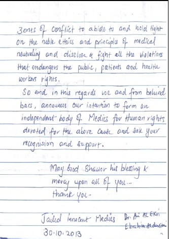 وطالب الكادر في رسالته العالم بالالتفات إلى أن "سجنهم الظالم كان بسبب التزامهم مبادئ الحياد الطبي". كما أشاروا إلى الظروف غير الصحية داخل السجن.