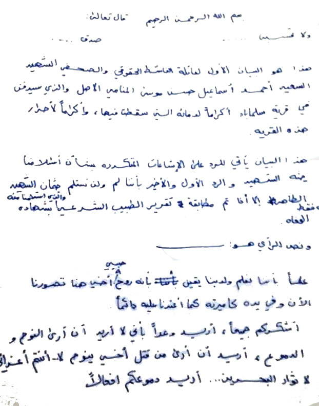 مرآة البحرين: جددت عائلة الشهيد أحمد إسماعيل (22 عاماً) رفضها استلام جثة الشهيد ما لم تتم مطابقة تقرير الطبيب الشرعي بشهادة الوفاة. وقالت في بيان أصدرته اليوم "هذا البيان يأتي للرد على الإشاعات المتكررة بشأن استلامنا جثة الشهيد، والرد الأول والأخير بأننا لم ولن نستلم جثمان الشهيد الطاهر إلا إذا تمت مطابقة تقرير الطبيب الشرعي (والذي استلمناه منه) بشهادة الوفاة".