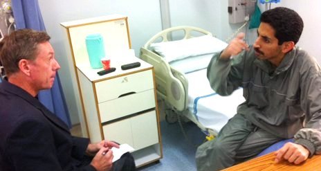 مرآة البحرين: زار صحفي من هيئة الإذاعة البريطانية (BBC) الناشط الحقوقي عبدالهادي الخواجة حيث يرقد حالياً في المستشفى العسكري، فيما أظهرتهما صور تمّ تداولها اليوم معاً.