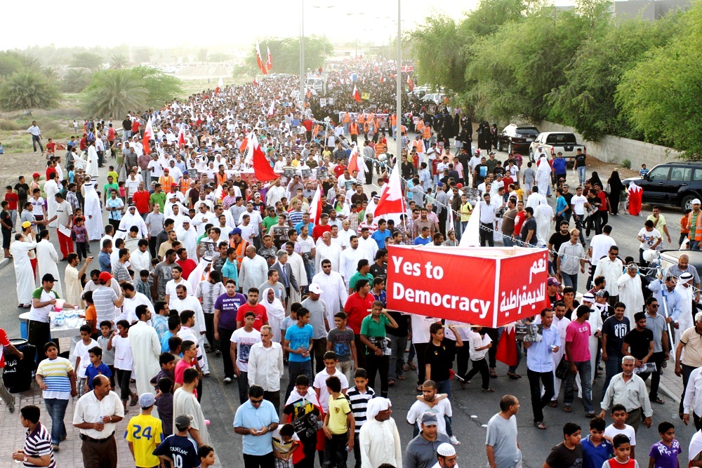 وقالت "الوفاق" و"وعد" و"الإخاء" و"القومي" و"الوحدوي" في المسيرة التي حملت عنوان ""الشعب اختار الديمقراطية ولا تراجع" إن "الموقف الرسمي الذي يتبنى الحل الأمني والقمع والبطش أسلوباً ومنهجاً لمعالجة الأزمة السياسية القائمة، يؤكد للمجتمع الدولي بما لا شك فيه بأن السلطة في البحرين عازمة على المضي في مشروع القتل والاعتقالات التعسفية والسياسية وقمع الحريات وعدم إفساح المجال لأي شكل من أشكال التعبير عن الرأي".
