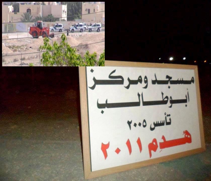 مرآة البحرين: قال رئيس الكتلة البلدية لجمعية الوفاق الوطني الإسلامية علي الجبل إن وزارة البلديات هدمت اليوم الاثنين بمعاونة الشرطة الجزء الذي أعيد بناؤه من مسجد "أبو طالب" في الدوار (19) بمدينة حمد. ورأى أن ذلك "يكشف عن استمرار الحرب المعلنة من السلطة تجاه المقدسات الإسلامية".