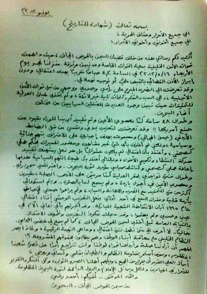 مرآة البحرين: في رسالة من سجن "الحوض الجاف"، روي الصحافي والمدون المعتقل أحمد رضي اعتقاله الشهر الماضي وتعرضه للتعذيب الجسدي والنفسي بهدف إجباره على الإعتراف بتهم سياسية.