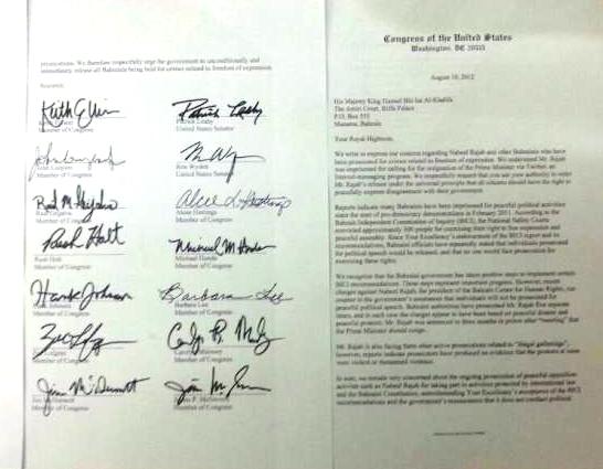 وقال أعضاء الكونجرس "خلاصة القول، فإننا لا نزال نشعر بقلق بالغ إزاء مقاضاة جارية إلى نشطاء مثل نبيل رجب بسبب معارضتهم السلمية، ومشاركتهم في الأنشطة التي يحميها القانون الدولي والدستور البحريني، على الرغم من قبول سعادتكم بتوصيات تقرير بسيوني، وتأكيد الحكومة على أنها لا تجري ملاحقات قضائية لدواعي سياسية". وحثوا الحكومة على "الإفراج، ودون قيد أو شرط، عن جميع المحتجزين البحرينيين بتهمة ارتكاب جرائم تتعلق بحرية التعبير" وفق ما جاء في الرسالة.