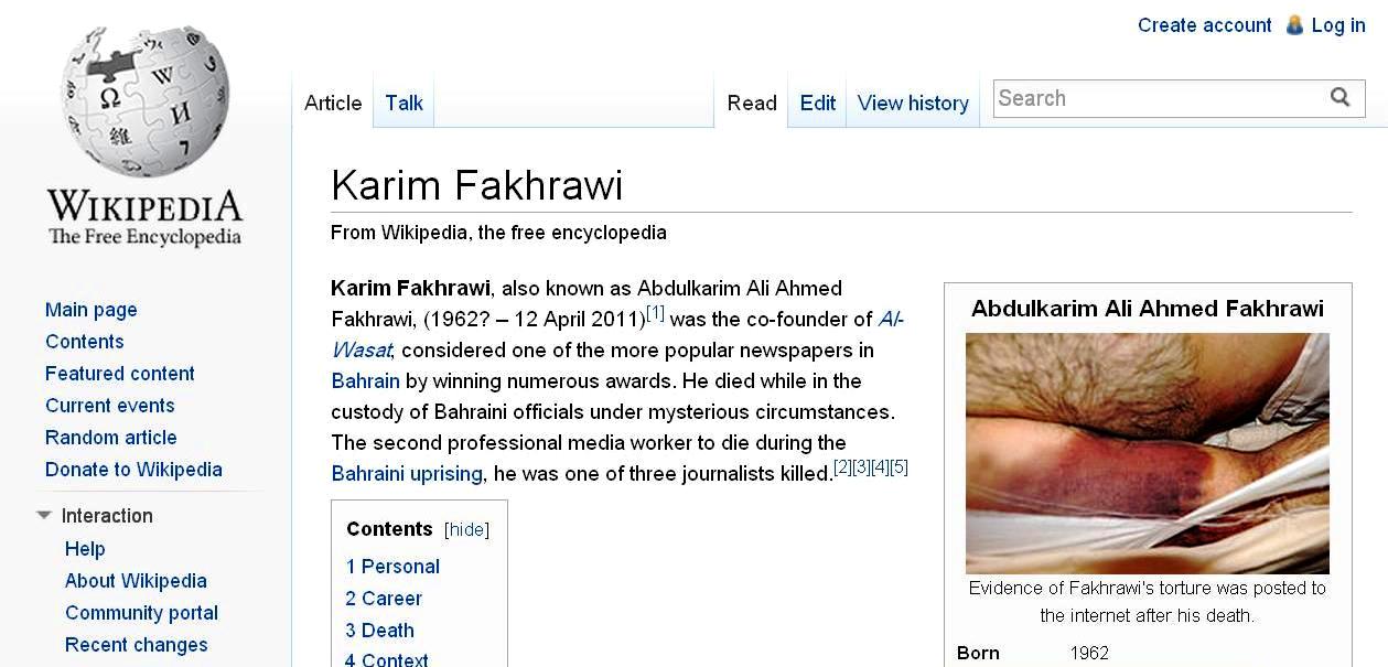 مرآة البحرين (خاص): دخل الشهيد "عبد الكريم فخراوي" موسوعة "ويكيبيديا" على شبكة الإنترنت بصفحة خاصة نشرتها عن سيرة حياته ومقتله، وذلك باللغة الإنجليزية.