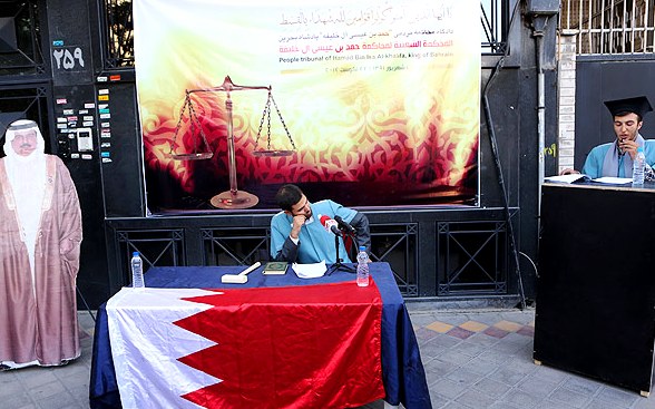 مرآة البحرين: نشرت وكالة "مهر" الإيرانية للأنباء صور المحكمة الرمزية لملك البحرين حمد بن عيسى آل خليفة، والتي أقامها طلبة جامعيون أمام سفارة البحرين في طهران. وتجمّع مئات من الطلاب والطالبات والناشطين بحضور عدد من الجالية البحرينية أمام السفارة حاملين لافتات مناهضة للنظام كتب على بعضها "أوقفوا القتل في البحرين" في حين طالبت لافتات أخرى بطرد سفير البحرين من إيران.