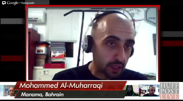 وأظهرت الخواجة على الهواء في برنامج لصحيفة هوفينغتون بوست الأمريكية حول الثورة البحرينية، تغريدة للمحرّقي، نشرها على حسابه الشخصي في "تويتر"، زعم فيها المعاملة الجيدة التي يحظى بها والدها، نافياً تعرضه إلى التعذيب، وقارنتها بما ذكره تقرير اللجنة الملكية لتقصي الحقائق برئاسة محمود شريف بسيوني، الذي سرد ألواناً من التعذيب تعرض لها الخواجة، وبينها كسر فكه الأمامي.