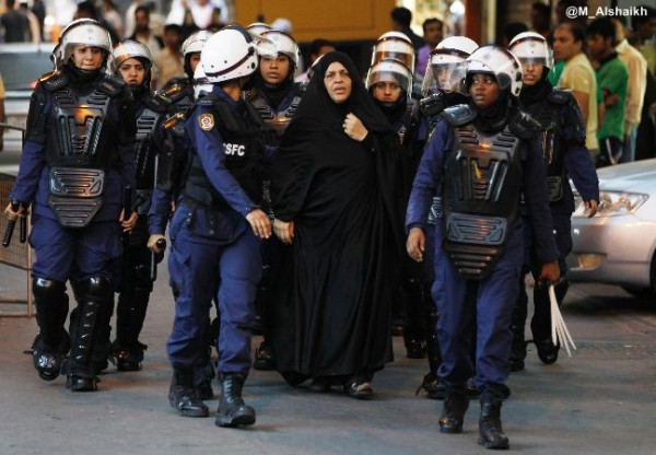 الحضور النسائي كعادته كان كبيراً. مسيرات نسائية خرجت من منافذ مختلفة بالقرب من مسجد الخواجة قريباً من مدخل السوق. تم قمعها على الفور. تنقل إحدى الشهود أنها سمعت ضابطاً يأمر الشرطة النسائية بضرب أية فتاة ترتدي علم البحرين. وكان ملحوظاً بشكل كبير استخدام المواد الحارقة ورشها على وجوه الفتيات تحديداً (تنقل مرآة البحرين شهادة إحدى الفتيات التي تعرضت لرش مادة حارقة على وجهها في تقرير منفصل). تكشف الصور التي نقلتها وكالات الأنباء عن اعتقال عدد من الفتيات، يظهرن في الصور غير قادرات على فتح أعينهن جراء المادة الحارقة التي تم رشها على وجوههن، فيما يتم اقتيادهن من قبل الشرطة النسائية وهن غير قادرات على الرؤية لمراكز الشرطة. بين هؤلاء الناشطة الحقوقية معصومة السيد وأكثر من فتاة أخرى غير معروفة. كما أظهر فيديو مصور اقتياد الشرطة النسائية لامرأة خمسينية، كانت تسير رافعة رأسها رغم التعب الذي كان بادياً عليها، وأظهر الفيديو عدد من الفتيات كن يحاولن إقناع الأمن بترك المرأة الخمسينية عندما تم اطلاق القنابل الصوتية عليهم من مسافة قصيرة.