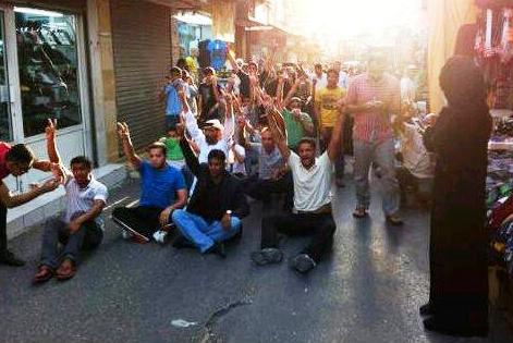 وأظهرت صورة بثها نشطاء على شبكات التواصل، عشرات المتظاهرين وهم يفترشون الأرض، رافعي إشارات النصر بأيديهم. وهي الحركة التي أصبحت فناً يكرره النشطاء من قبيل الحرب النفسية إزاء عناصر الشرطة التي سبق لها القيام بخطف الحقوقي نبيل رجب، وضربه في الادعاء بالقول إنها وجدته مستلق.
