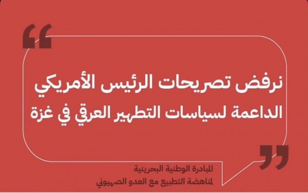 مرآة البحرين : أعربت المبادرة الوطنية البحرينية لمناهضة التطبيع مع العدو الصهيوني عن رفضها واستنكارها الشديدين للتصريحات الأخيرة التي أدلى بها الرئيس الأمريكي دونالد ترامب، والتي دعا فيها إلى تهجير أهالي قطاع غزة، محذرة من خطورة هذه التصريحات وما تخفيه من مخططات استعمارية تهدد استقرار المنطقة بأكملها وتسعى لتصفية القضية الفلسطينية.