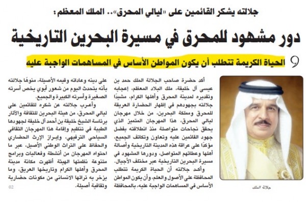 ونوّه الملك -بحسب الخبر الرسمي الصادر عن وكالة أنباء البحرين- بأنه يتحدّث من شعور أبوي يخصّ أسرته الصغيرة وأسرته الكبيرة والجميع، في تناقض واضح مع قلق المواطنين من القرارات الجديدة الصادمة، مسهباً في تصريحه بالإشادة بدور مهرجان "ليالي المحرق" في إبراز الإرث الحضاري والحفاظ على التراث الوطني الأصيل عبر ما احتواه من أنشطة وفعاليات وبرامج متنوعة أظهرت مكانة مدينة المحرق وأهلها الكرام وتاريخها العريق وما يزخر به تراثها الإنساني من مكونات حضارية وثقافية أصيلة.