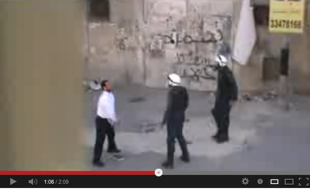 مرآة البحرين: أحد المحتجين السلميين يثور غضبا في وجه المرتزقة بعد قتلهم الشهيد حسين الجزيري ويخاطبهم بالسفاحين والمجرمين والقتلة، ثم يرفض التراجع ويقف بكل شجاعة في مقابل طلقاتهم.