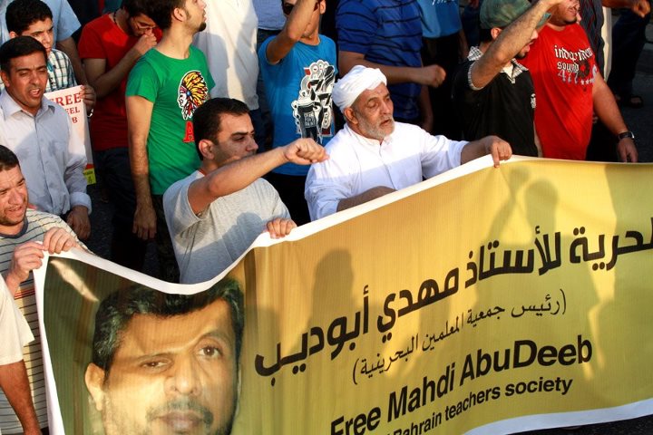 وأكد أبو ديب دعمه لنائب رئيس جمعية المعلمين البحرينية التي فصلتها وزارة التربية من عملها مؤخرا، "لنيل حقوقها كاملة".