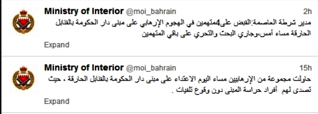واستخدموا قنابل «المولوتوف»، حيث ألحقوا أضراراً بأحد أبراج المراقبة التابعة للمبنى الذي كان مقرّاً لرئاسة الوزراء قبل انتقاله إلى الموقع الجديد في القضيبية. وشنت قوات الأمن التي نفذت استنفاراً شاملاً في أعقاب ذلك، حملة تمشيط واسعة شملت عدداً كبيراً من البيوت في العاصمة المنامة، وأسفرت عن اعتقال 10 أشخاص.