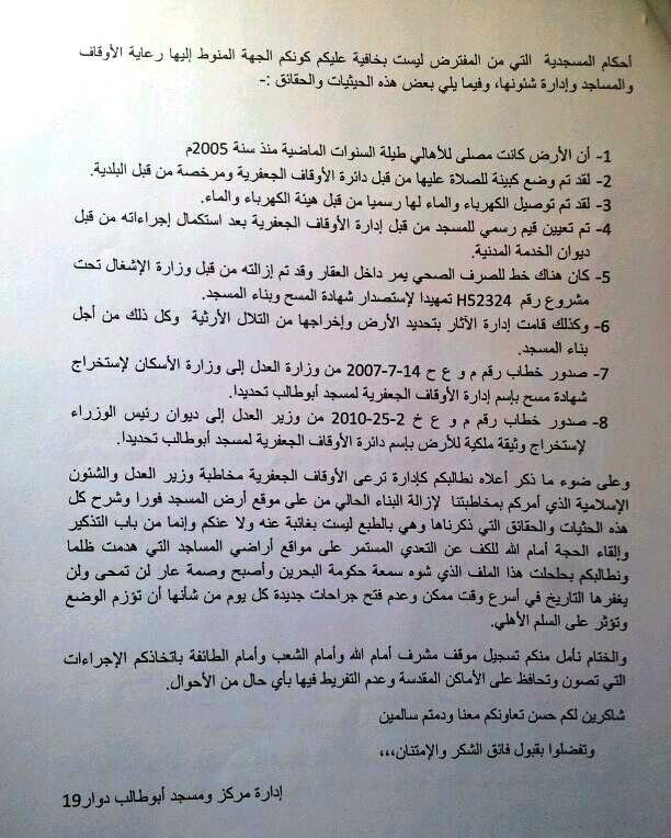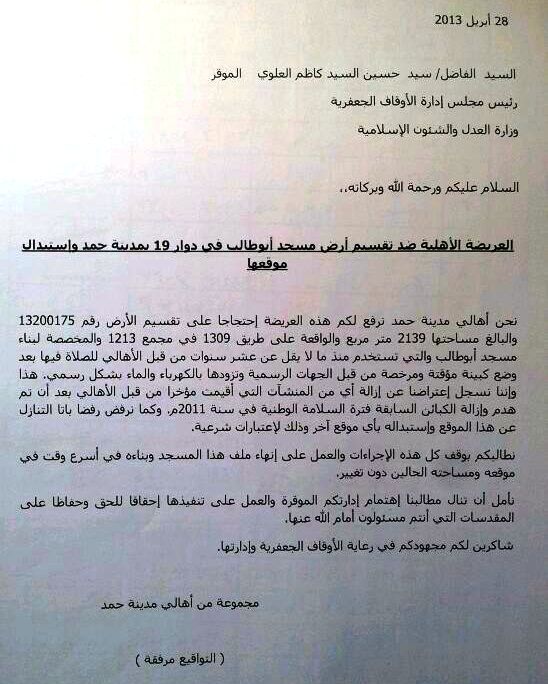 عريضة من أهالي مدينة حمد للأوقاف الجعفرية ترفض التنازل عن موقع مسجد أبو طالب
