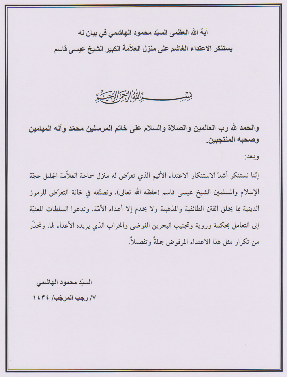 مرآة البحرين: استنكر المرجع الديني آية الله السيد محمود الهاشمي الاعتداء على منزل الشيخ عيسى أحمد قاسم، واصفاً إياه بـ«الأثيم».