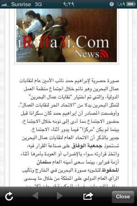 وأكد الاتحاد ان الصورة المنشورة ليست لإبراهيم حمد، الذي شارك بفعالية ضمن وفد الاتحاد العام لنقابات عمال البحرين، وحاز عضوية اللجنة التنفيذية لمنظمة العمل الدولية.
