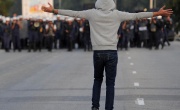 مرآة البحرين: أحد المحتجين السلميين يثور غضبا في وجه المرتزقة بعد قتلهم الشهيد حسين الجزيري ويخاطبهم بالسفاحين والمجرمين والقتلة، ثم يرفض التراجع ويقف بكل شجاعة في مقابل طلقاتهم.