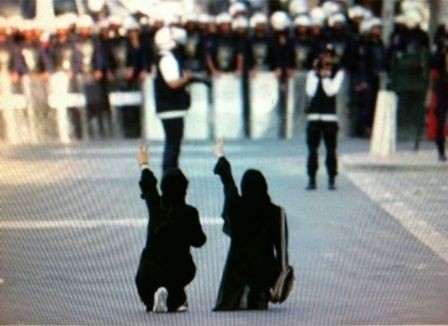 A day earlier, (Rihana) along with (Nafeesa Al-Asfoor) had a sit-in by Karbabad beach, where they handcuffed their hands and wore T-shirts with pictures of detained activists. They both raise the victory sign. That picture spread widely.