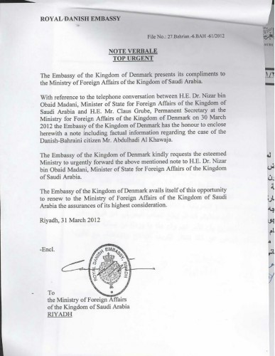 Bahrain Mirror (Exclusive): A cable published by the WikiLeaks website and linked to the archives of the Saudi Ministry of Foreign Affairs, dated March 31, 2012, revealed a telephone conversation between Dr. Nizar bin Obaid Madani, Minister of State for Foreign Affairs of the Kingdom of Saudi Arabia, and Mr. Claus Grube, Permanent Secretary at the Ministry of Foreign affairs of Kingdom of Denmark, after the Embassy of the Kingdom of Denmark in Riyadh handed in information and an enclosed note to the Saudi Ministry of Foreign Affairs regarding the detained Bahraini human rights activist, who is currently sentenced to life-imprisonment and who also holds the Danish citizenship, Abdulhadi Al-Khawaja.