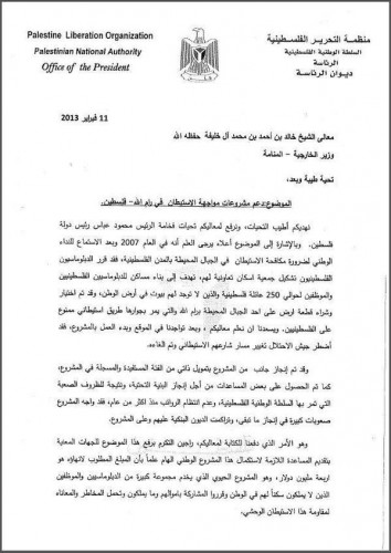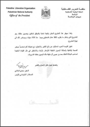 Document: Palestinian Authority Requested 4 Million Dollars from Bahrain to Build Domiciles for its Diplomats