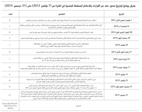 The newspaper added that on December 31, 2015 Bahrain's High Court of Appeals approved the death penalty handed down to the first suspect, life imprisonment to 7 suspects, 10-year prison terms to 4 suspects, and verdict to revoke the citizenships of all of the 12 suspects over charges of murdering a policeman in Al-Ekr case on July 4, 2014. Meanwhile, Bahrain's Fourth High Criminal Court issued its verdict against 23 defendants on the same day. The court handed down a death penalty to the first suspect and sentenced all the other suspects to life in prison, revoked the nationality of all suspects and fined the third and fourth 200,000 Bahraini dinars, over founding and joining a terrorist group, murdering a policeman on duty, murdering a civilian, detonating a bomb, having possession of and using explosives and weapons for terrorist purposes, collecting funds for a terrorist group, joining an assembly, rioting and having possession of Molotov cocktails.