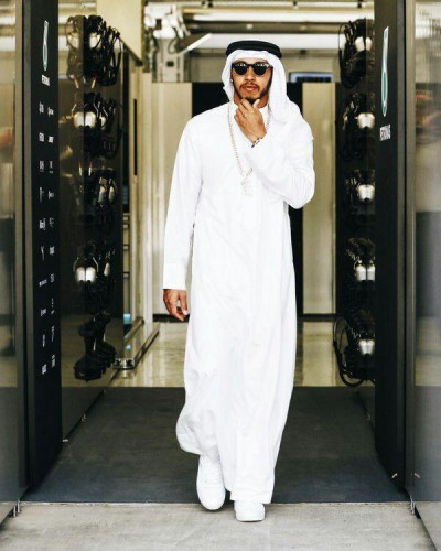 Hamilton, 31, arrived at the Bahrain International circuit in Sakhir dressed in a full white thobe, the traditional attire worn by the Arabic elite.