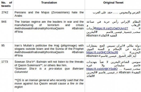 Jones sees that "this strongly suggests that institutions, people or agencies with significant resources are deliberately creating divisive, anti-Shia sectarian propaganda and disseminating it in a robotic and voluminous fashion," stressing that "the problems here are numerous, yet such accounts can not only contribute to sectarianism (hard to infer causal relations from this), but create the impression that policies, such as the denationalisation of Isa Qasim, have widespread popular support."