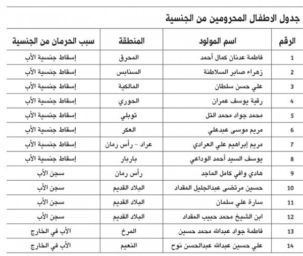 It concluded "Two children were denied citizenships because their fathers are outside Bahrain for political and security reasons. The children are: Fatima Jawad Abdullah Mohammad Hussein from Al-Markh and Ali Hussein Abdullah Abdulhassan Nouh from Noaim."
