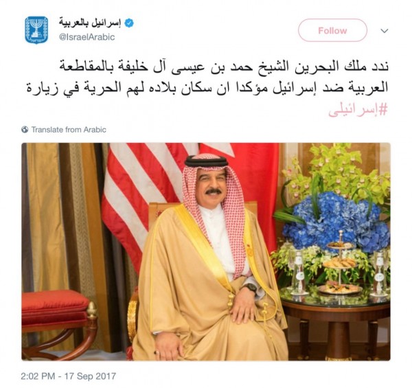 "Bahrain's King Hamad bin Isa al-Khalifa denounced the Arab boycott against Israel and has confirmed that Bahraini citizens are now free to visit Israel," the tweet read in Arabic.