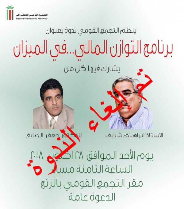 A number of activists circulated a text message they received on Sunday (October 28, 2018) that read: "The General Secretariat of the Nationalist Assembly announces the cancellation of a seminar on the financial balance program tonight because of the Ministry of Justice's request in a phone call with the Assembly's secretary-general to cancel the participation of Mr. Ibrahim Sharif in the seminar."