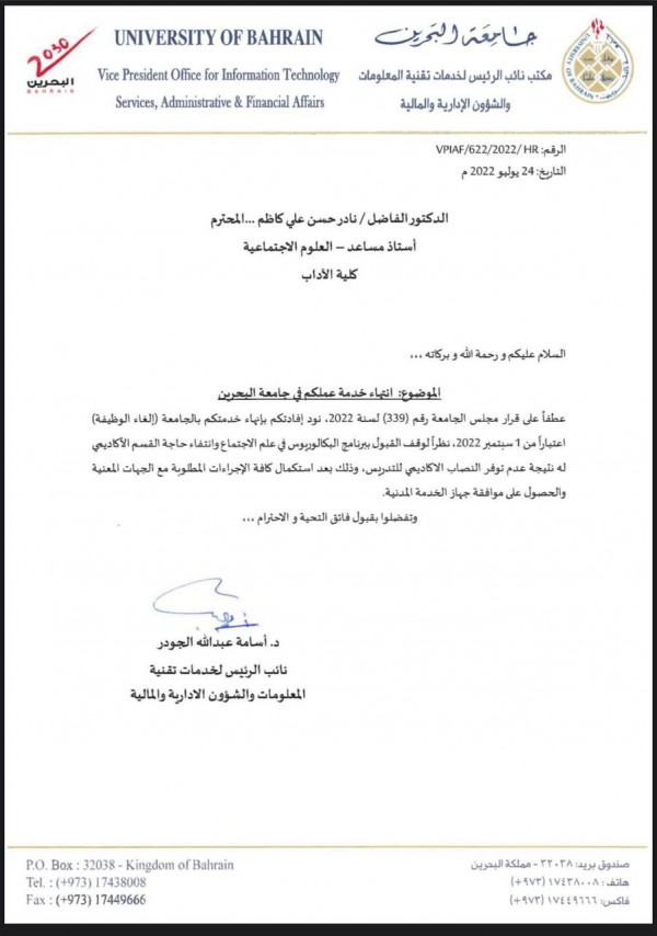 A document was published, which has not been verified yet, stating that the termination of Kadhim's services came as a result of "the academic department no longer needing him due to the lack of an academic quorum."