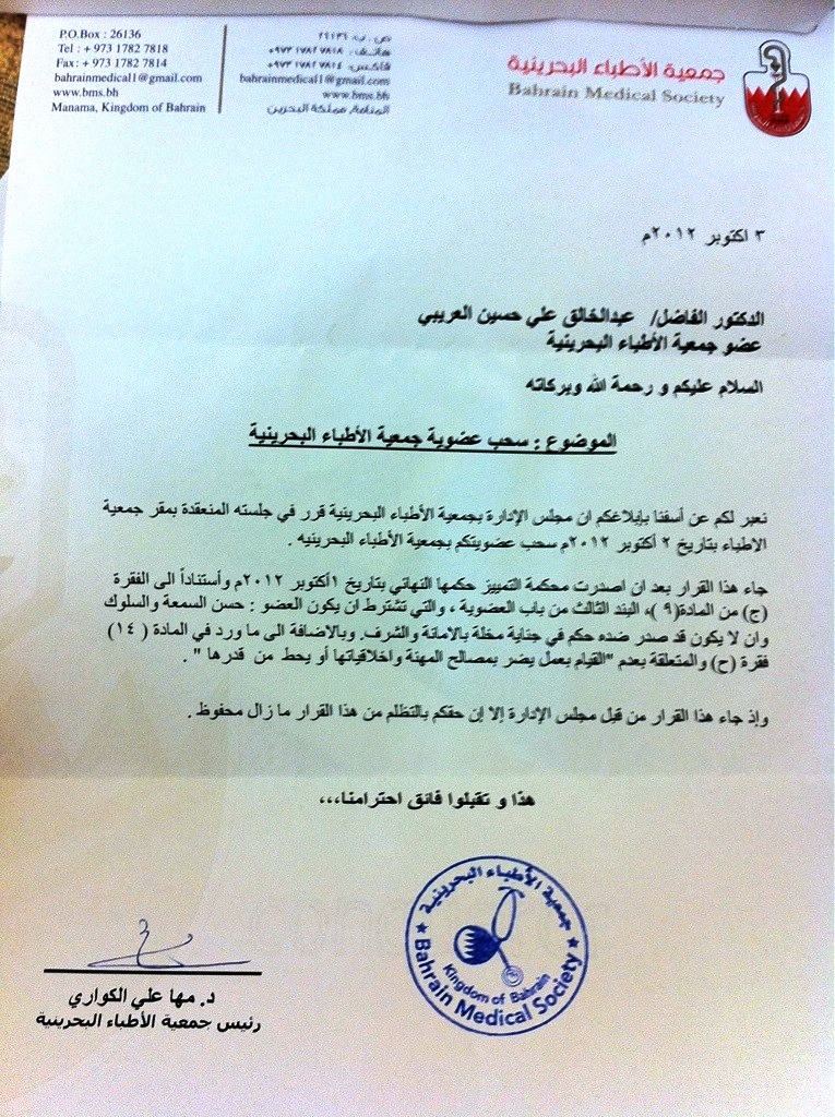 the membership of some medics from BMS. It sent registered letters to the medics –of whom I was one- signed by Dr Maha Al-Muqla which stated “we regret to inform you that the BMS Board of Directors has decided in its session on 2nd October 2012 to withdraw your BMS membership. This decision follows the final verdict issued by the Supreme Court on 1st October 2012. By virtue of paragraph (c), article (a), third clause, of the membership chapter, which requires that the member must be of good conduct and reputation, and must not be subject to a verdict condemning him of a crime of indecency or dishonesty. In addition to the text of paragraph (h), article 14, concerning refrainment from any act that jeopardizes the interests and ethics of the profession or degrades it”.