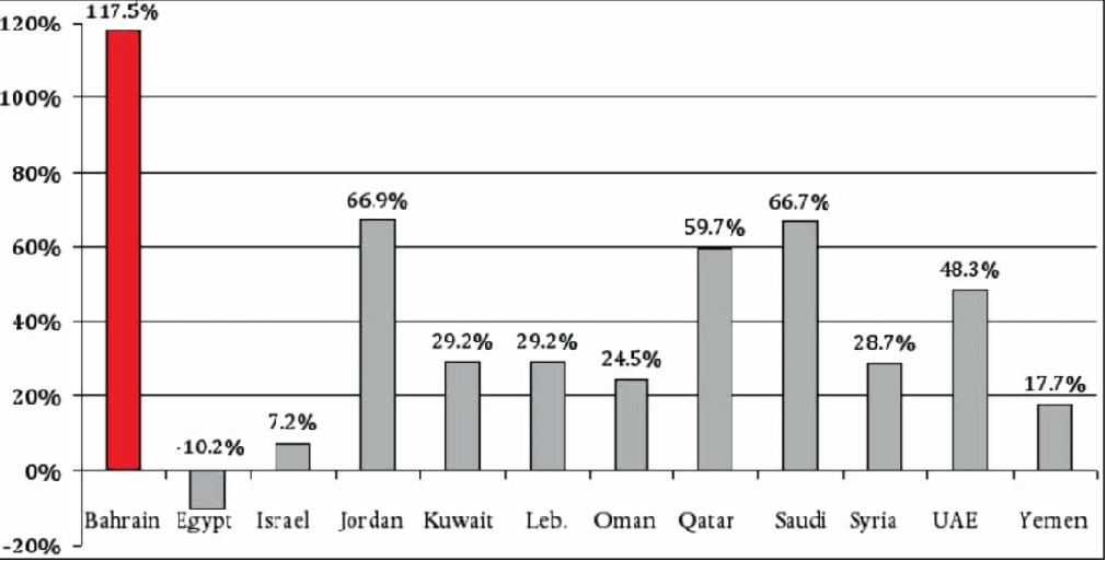 (75) تمثل تلك البيانات بطبيعة الحال جانبا واحدا من الإنفاق الكلي والانشغال بالأمن الوطني. أما ما لا يمكن معرفته من هذا هو الإنفاق على الشرطة والأمن والخدمات الداخلية الأخرى، التي لم تتوفر بياناتها بالمثل. من ناحية أخرى، تم تكليف قوة دفاع البحرين ليس فقط "للدفاع عن البحرين ضد العدوان الأجنبي" ولكن أيضا "للمساعدة في حماية السلطة الحاكمة الشرعية وسيادة الدستور والمساعدة... في الحفاظ على الأمن والنظام وسيادة القانون ". [لجنة تقصي الحقائق، تقرير لجنة البحرين المستقلة لتقصي الحقائق، 23 تشرين الثاني/نوفمبر (راجع 10 كانون الأول/ديسمبر) 2011، ص. 51.] وهكذا، فإن الزيادات العالية بشكل غير متناسب في البحرين على الإنفاق العسكري من 2001 إلى 2011 بالمقارنة مع بلدان أخرى في المنطقة توحي بأن قادتها كانوا يضعون رهاناتهم ضد نتيجة سلبية ممكنة من برنامج الملك حمد الإصلاحي.