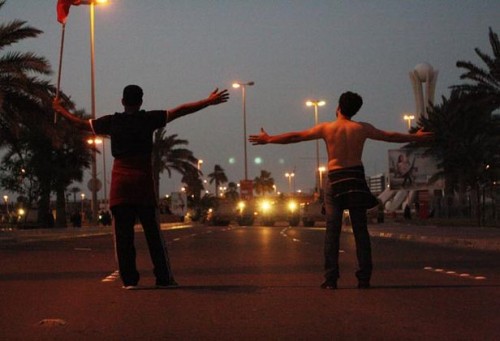 هنا يتقدم (علي صنقور) نحو بركة دم رضا، يمرّغ يده في حرارتها، يلطّخ بها صدره العاري، ثم يتجه ناحية آليات الجيش ودباباتهم مادًا يده العزلاء، يريد أن يريهم كم هو مدجّج بحب الوطن فقط، وكم هم عزّل عن حب الوطن. يصرخ في وجه القناصين المتأهبين للقتل: "أنا أمي سنية وأبي شيعي فإن كنت بحريني تعال وكلمني".