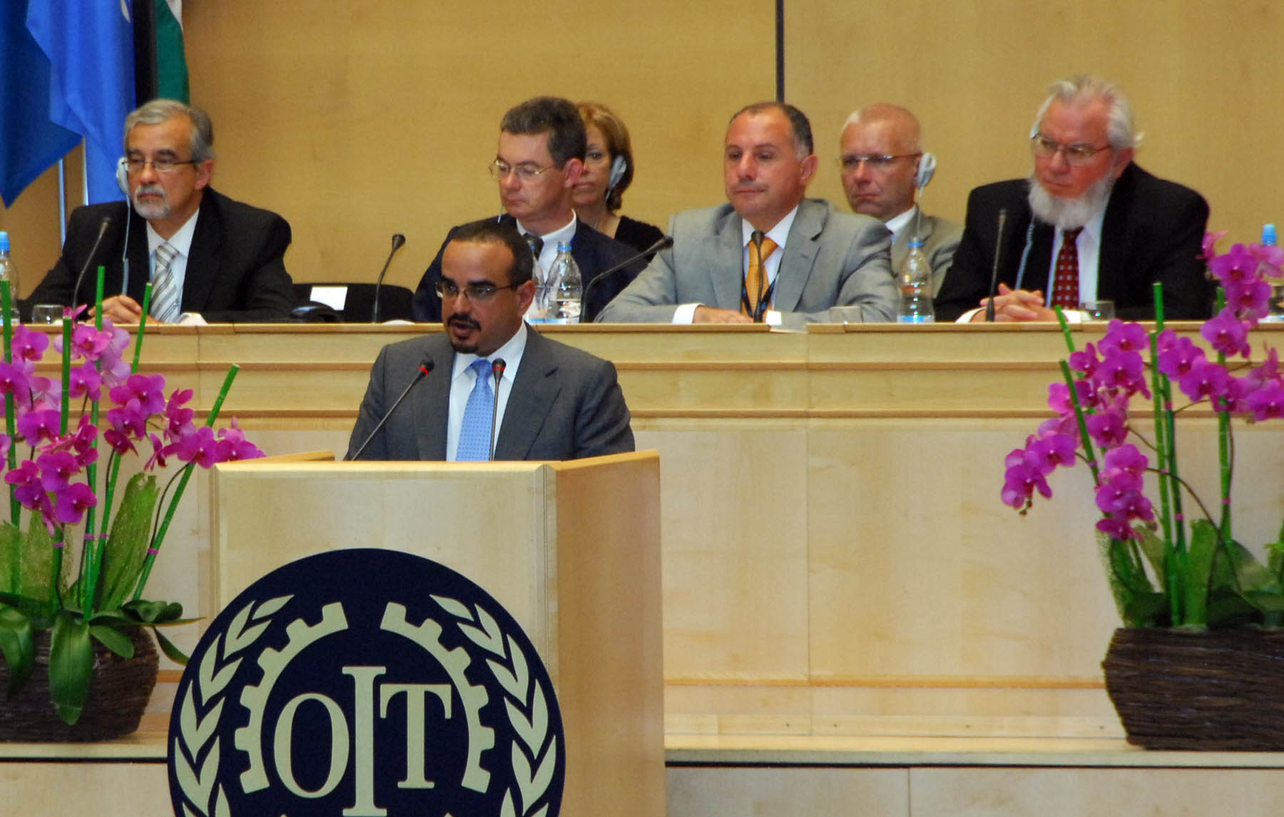 حثت البحرين على اعادة المفصوين، ولي العهد في صورة أرشيفية أمام منظمة العمل الدولية
