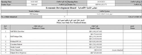 يذكر أن المناقصة كانت (محدودة)، أي أن التقديم لها مسموح لمجموعة مختارة من الشركات فقط، وقد كان أقل العطاءات يبلغ 725 ألف دينار، في حين وصل أعلاها إلى أكثر من 9 ملاييين دينار.