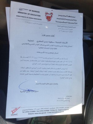 مرآة البحرين: تواصل وزارة التربية والتعليم استهداف العاملين لديها من المنتمين للطائفية الشيعية، فقد قامت بإنزال رتبة الأخصائية سكينة العكري من وظيفتها كأخصائية، إلى صفة معلمة أولى في مدرسة ابتدائية.