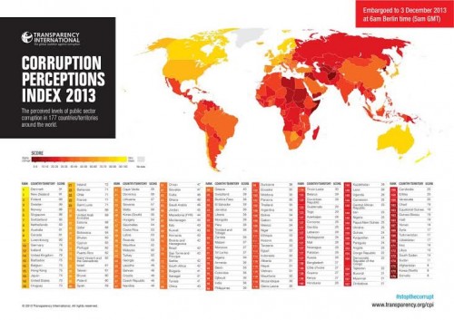 مرآة البحرين: أصدرت منظمة "الشفافية الدولية" اليوم الثلاثاء مؤشر مدركات الفساد للعام 2013، حيث استمرت البحرين في الهبوط وحلت في المركز 57 برصيد 48 نقطة، بعدما كانت في العام 2012 في المركز 53 برصيد 51 نقطة.