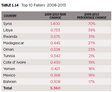 وبعد أن بلغ أفضل مستوياته في العام 2010 بمعدل 1.78 (1 الأفضل، 5 الأسوأ)، مؤشر الساقطين ذريعا إثر انطلاق احتجاجات 14 فبراير/شباط، ليصل إلى 2.192، وكانت البحرين مصنّفة على أنها الدولة 47 من حيث انتشار السلام على مستوى العالم، لكنّ هذه المرتبة تدهورت بحدة لتصل إلى ذيل القائمة (99 من 162) في العام 2011، و95 حسب آخر مؤشر (2013).